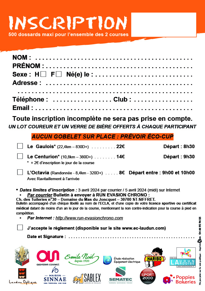 - Inscription (en ligne ou sur place): https://run-evasionchrono.com/laudun/